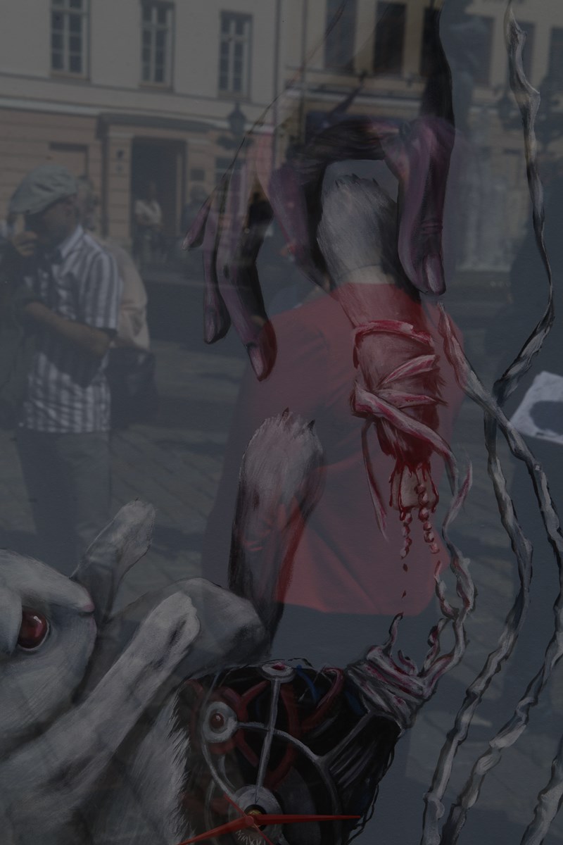 Lõputöö kaitsmine raekojaplatsis. Fotod raekojaplatsis pildistas Tartu Kõrgema Kunstikooli fotograaf. Ei tea kahjuks nimetada kes, sest fotod jõudsid lõpetajateni läbi pilve kaustades, sealt ma need endale sain igatahes.