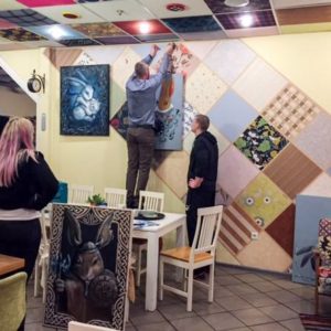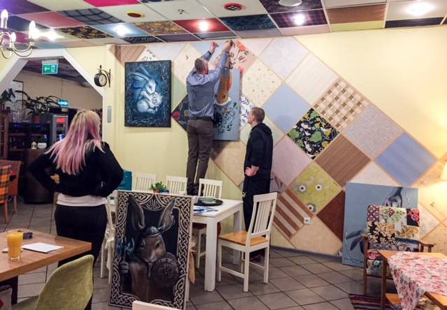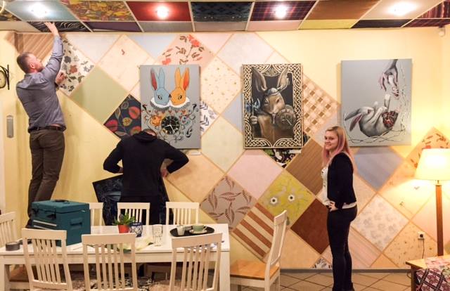 Nagu eelnevas postituses mainisin, siis näitus kohvikus Fe “Sõbrad pöörasel teeõhtul!” oli avalöögiks Slowball projektile. Kohvik Fe võttis minuga ühendust ning pakkus korraldada näitus nende ägedas kohvikus. Käisin ruumi vaatamas ning hakkasime üritust planeerima. Rääkisin näituse plaanidest ka Slowball projektijuhile, kellel tekkis koheselt mõte ühendada mõlemad projektid ning nii me kõik koos sõbralikult hakkasime näitusprojekti kallal töötama.