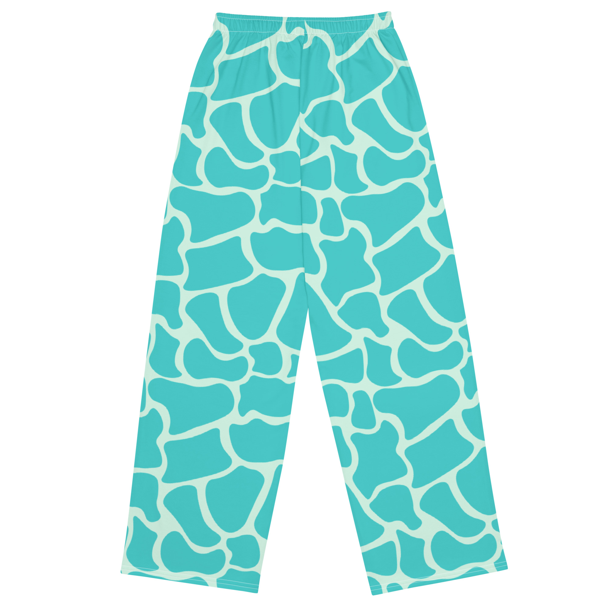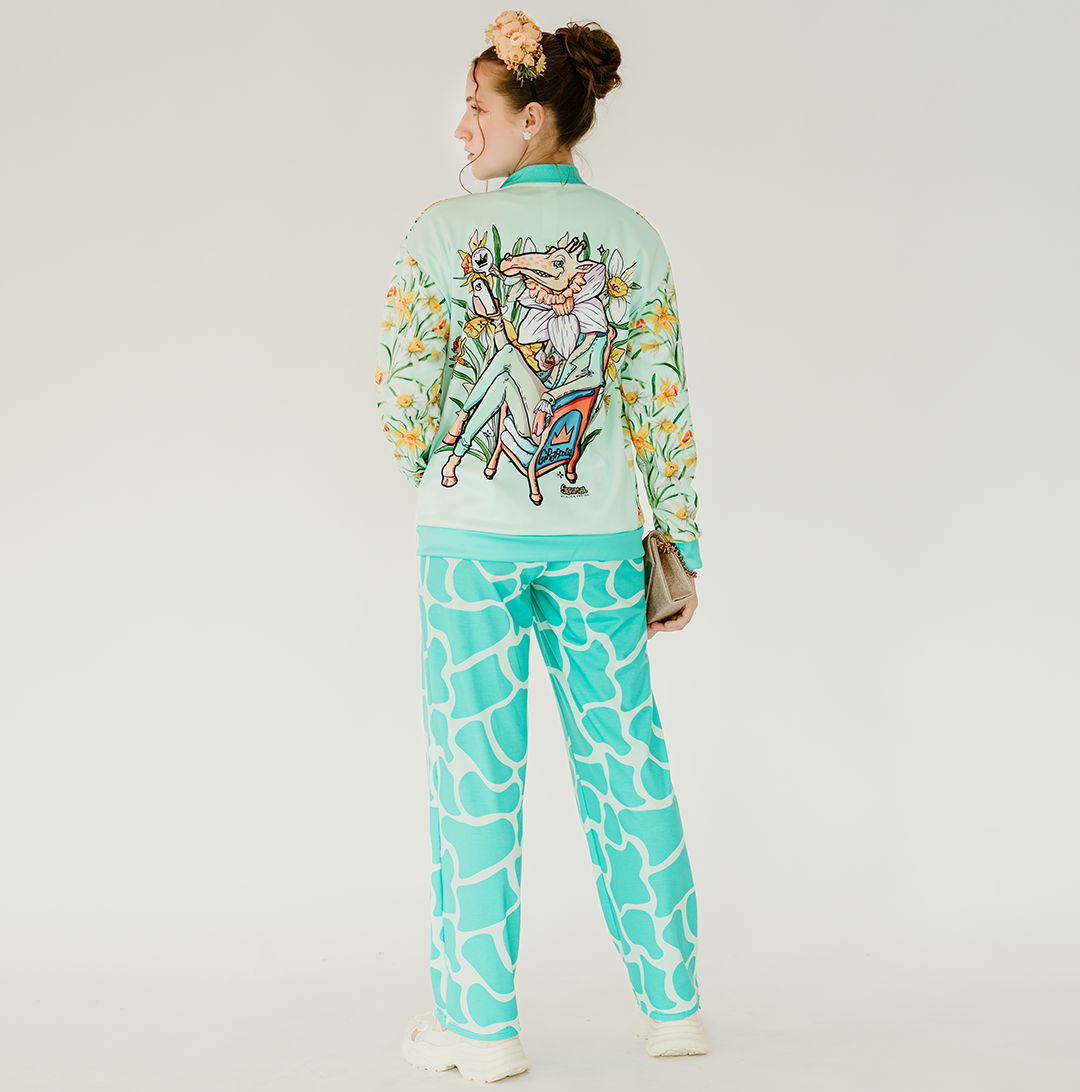 Laiad püksid Girafika toovad garderoobi unikaalse mustrimängu. Nende kaelkirjakumotiiv, mis mängib türkiissinise ja roheka varjundiga, on justkui eksootiline vaade läbi kunstniku pilgu – julge, ent pehme.
