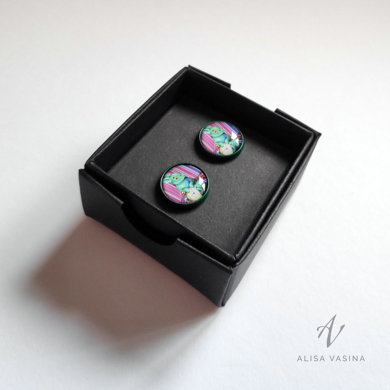Need kõrvarõngad sobivad iga riietuse juurde, lisades komplektile värvilist sära ja rõhutades kandja isiksust. Ehted on valmistatud värviga kaetud messingist. Värviga kaetud ehe sobib metalliallergikutel seni kuni värv püsib tootel. Pilt on kaetud epoksiidvaiguga, mis tagab selle säilivuse. Kõrvarõngaste diameeter on 14 mm, mis on just õige suurus, et välja paista, kuid jääda elegantselt tagasihoidlikuks. Need kerged kõrvarõngad sobivad igapäevaseks kandmiseks, segamata kandja igapäevaseid toimetusi.