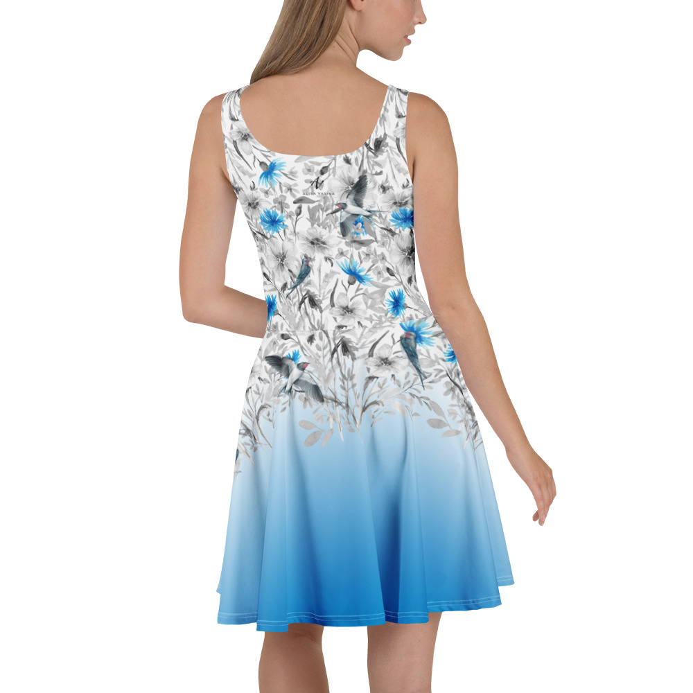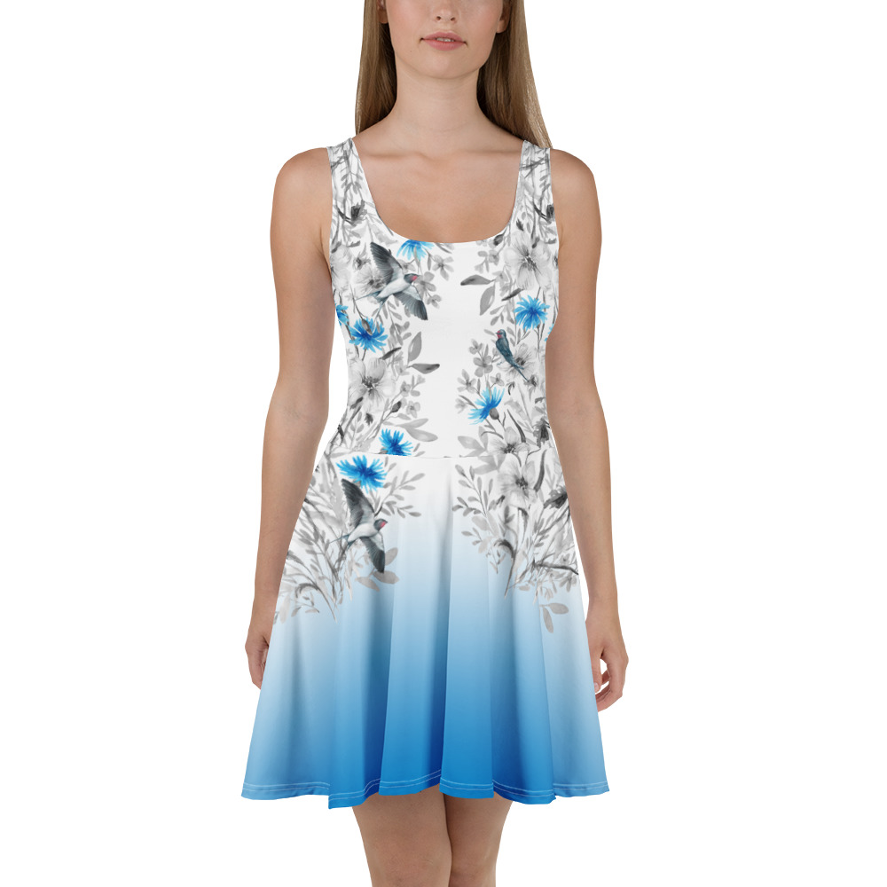 Skater kleit pääsukesed on särav, kerge ja helge. Valgel taustal lendlevad graatsilised pääsukesed, nende vahel õitsemas sillerdavad rukkililled – kaks looduse sümbolit, mis kohtuvad kaunis ja ajatus mustris.
