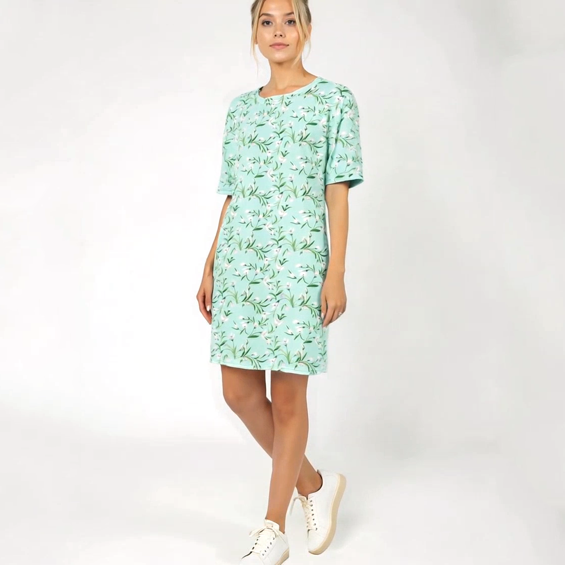 Oversize lõige ja pehme, langev kangas muudavad selle kleidi mitmekülgseks rõivaesemeks, mida saab kanda kleidina, tuunikana või pikema T-särgina. See sobib ideaalselt nii igapäevaseks kandmiseks kui ka kevadistesse hetkedesse, mil soovid oma riietusega edasi anda midagi õrna ja tähenduslikku.