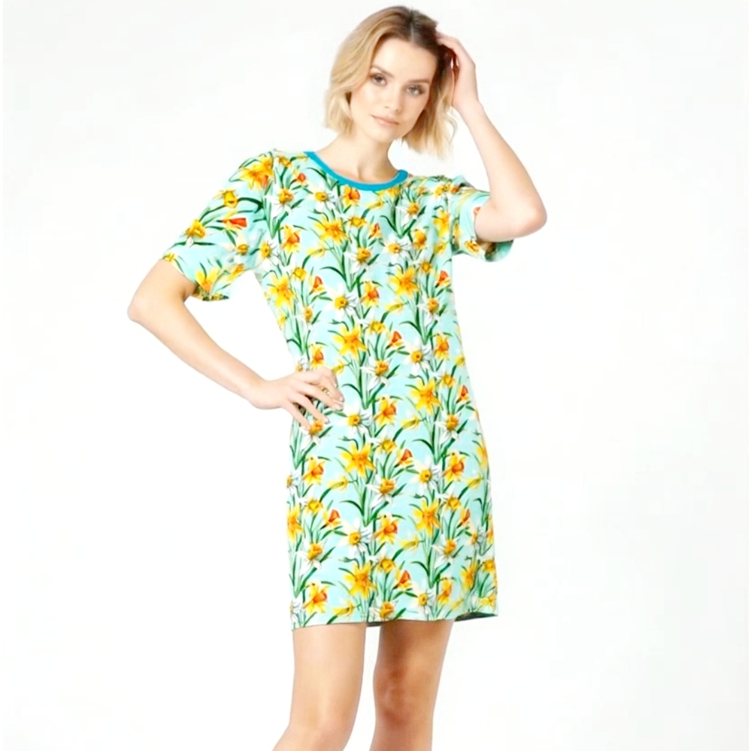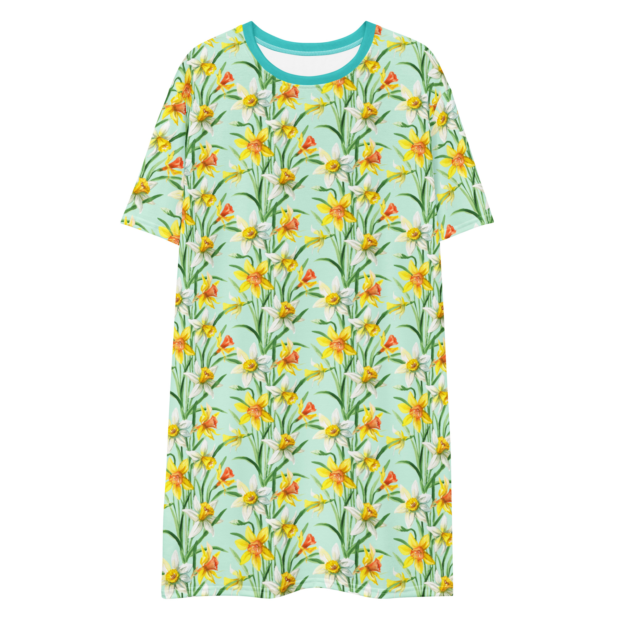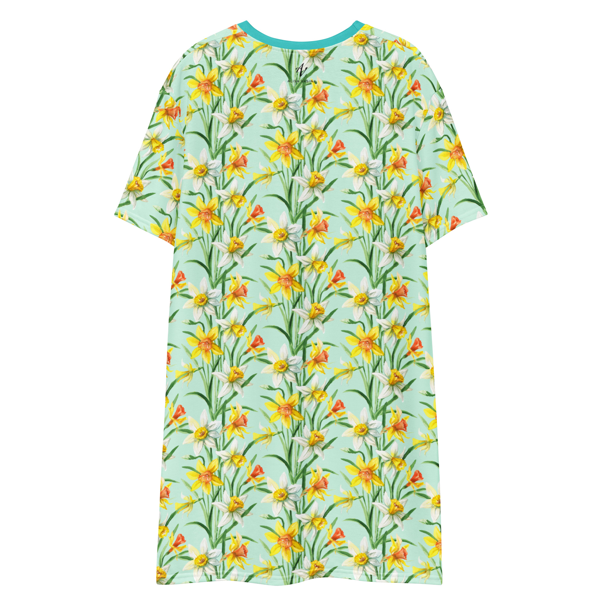 T-särk kleit nartsiss on kevadiselt rõõmus ja värskendav rõivavalik, mille disaini kaunistavad päikeselised kollased nartsissid – uue alguse ja elujõu sümbolid. Hele taust toob lillede erksad toonid kaunilt esile, luues selge ja helge visuaali, mis sobib nii argipäeva kui pidulikemasse hetkedesse.