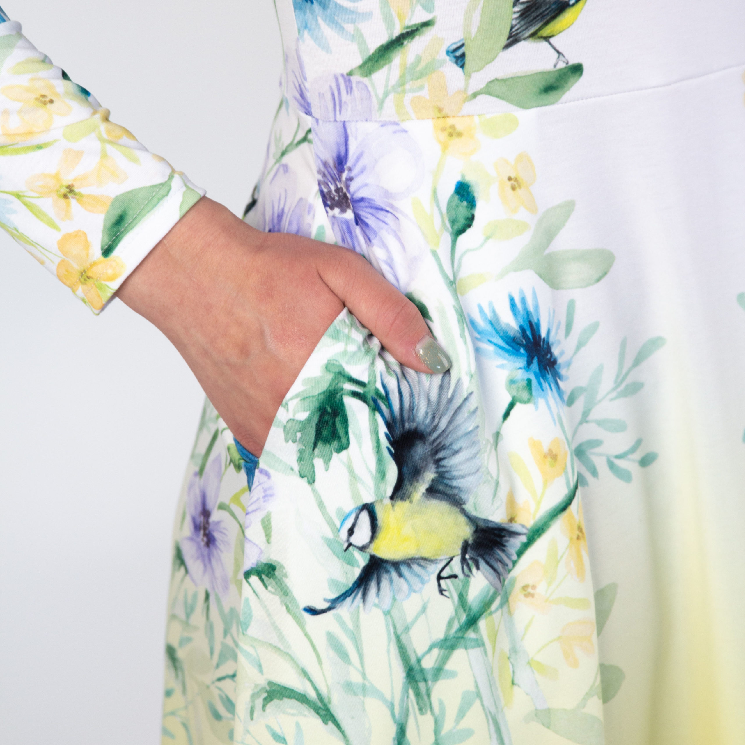 See kleit on praktiline ja kaunis, varustatud sügavate küljetaskutega, mis teevad selle eriti mugavaks igapäevaseks kandmiseks või pidulikeks sündmusteks. Taskutesse mahub kõik oluline, alates mobiiltelefonist ja pangakaartidest kuni võtmete ja muude pisiasjadeni, nii et naine ei pea muretsema käekoti pärast. Kleidi taskus on peidus kangale trükitud motiveeriv sõnum “Päästa oma tiivad valla”, mis innustab linnutiivul lendama positiivsete muutuste poole.