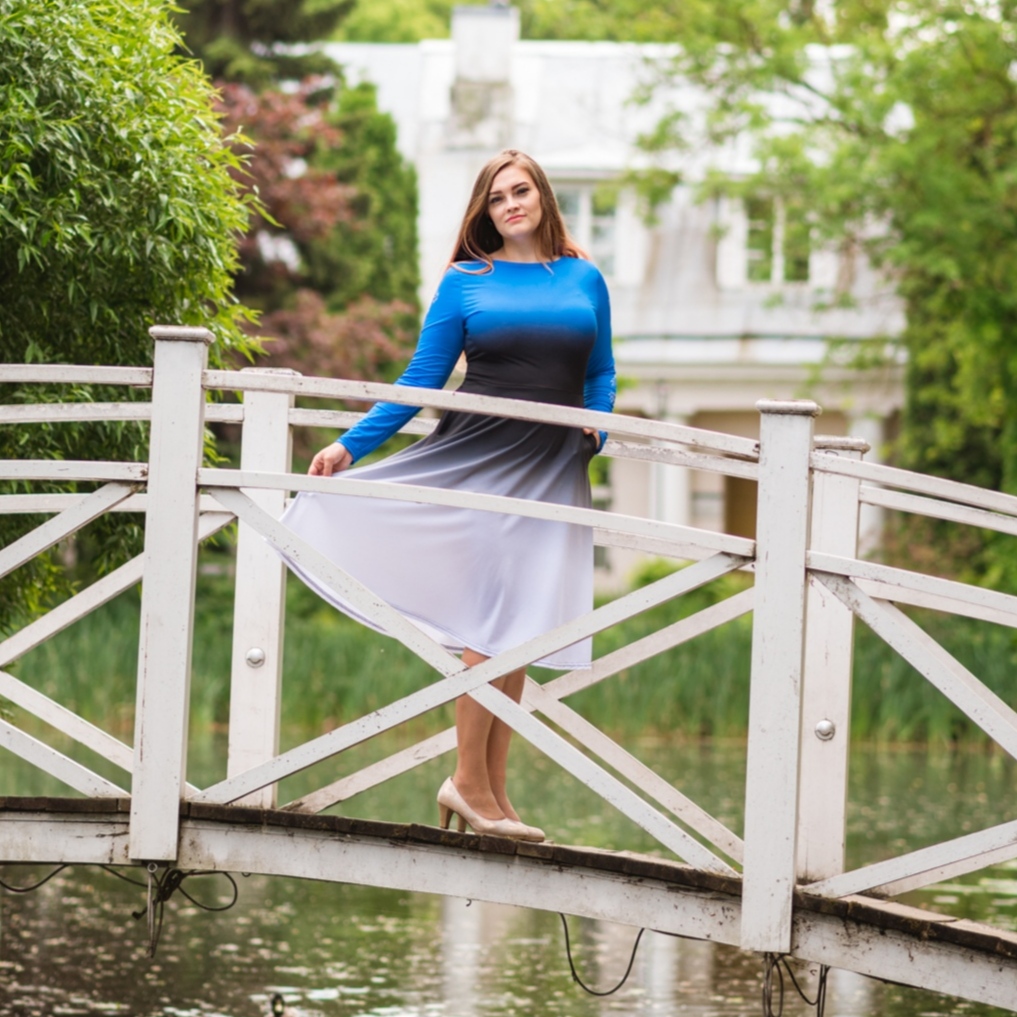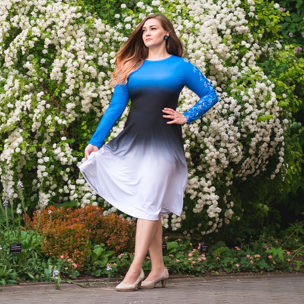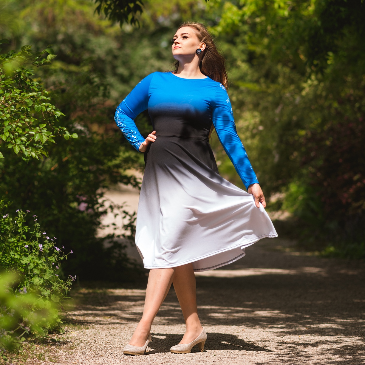 Rahvusromantiline kleit on disainitud Eestis ning on inspireeritud Eesti riig ilipuvärvidest.