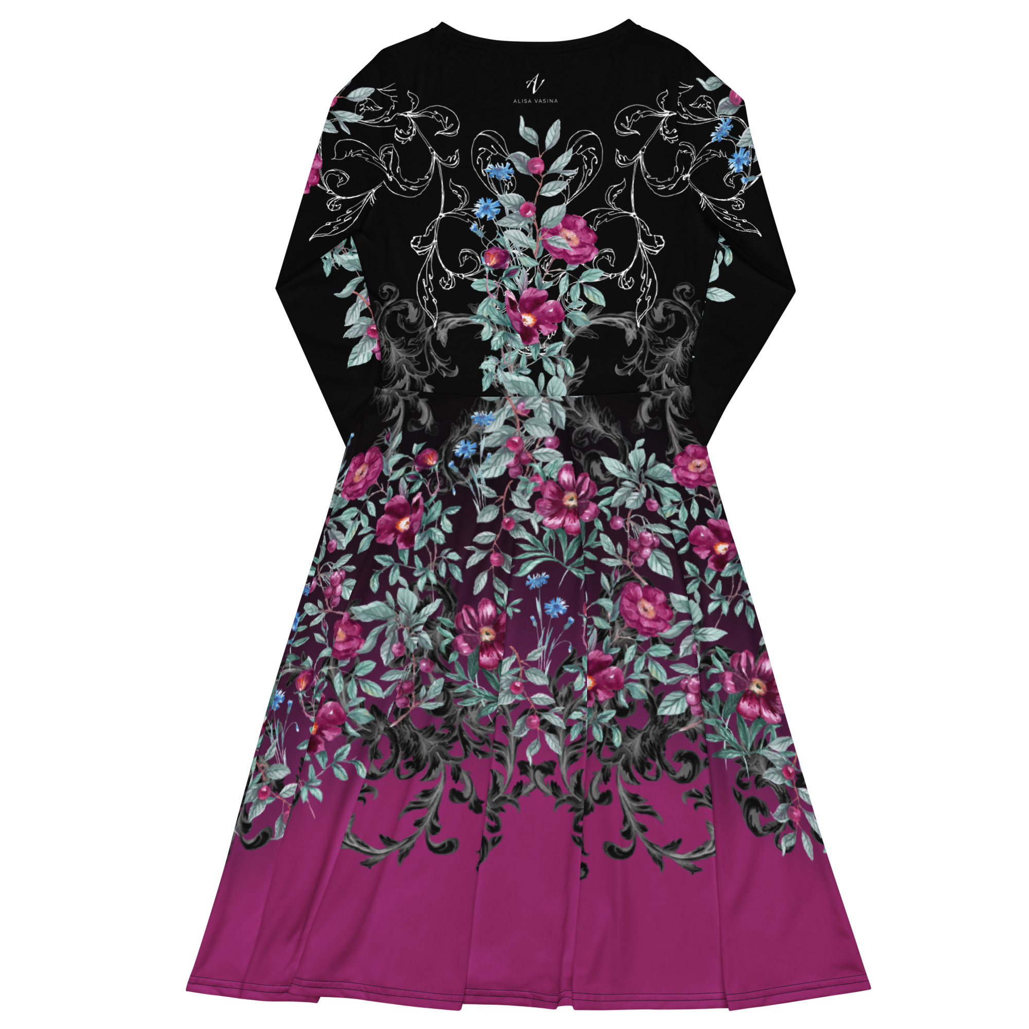 Taskutega midikleit rikkalik lumeroos on küllus ja elegants ühes. Selle kleidi keerukas kompositsioon ühendab lumeroosi akantuse lehe motiiviga, voogudes korsetiosast allapoole seelikule ja varrukatele. Külluslik disain ja ajatu stiil loovad muljetavaldava välimuse, sobides majesteetliku tunnetusega persoonile, kes hindab keeruka disaini võlu ja küllust.