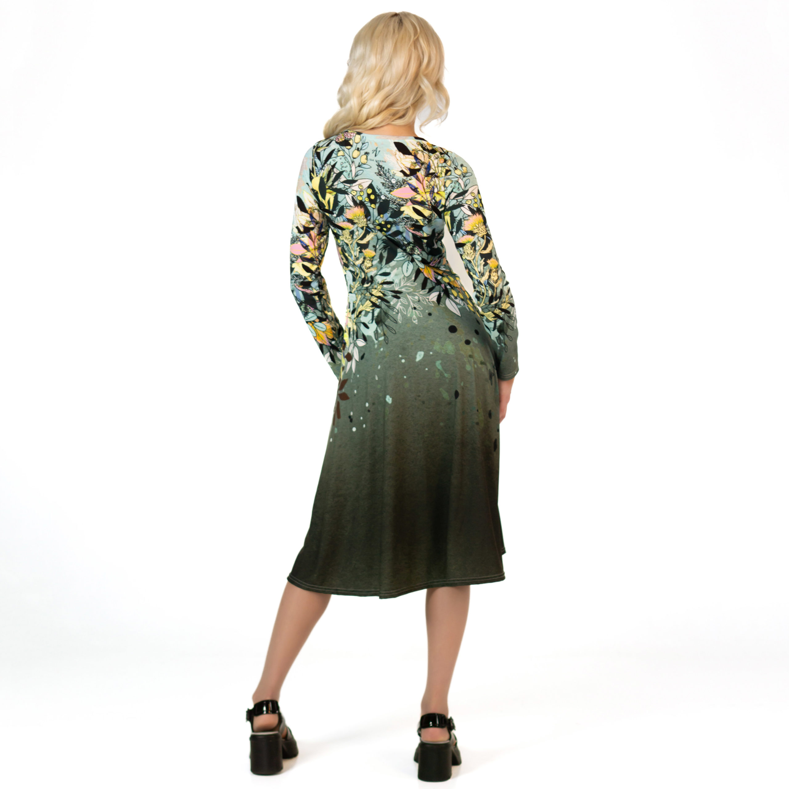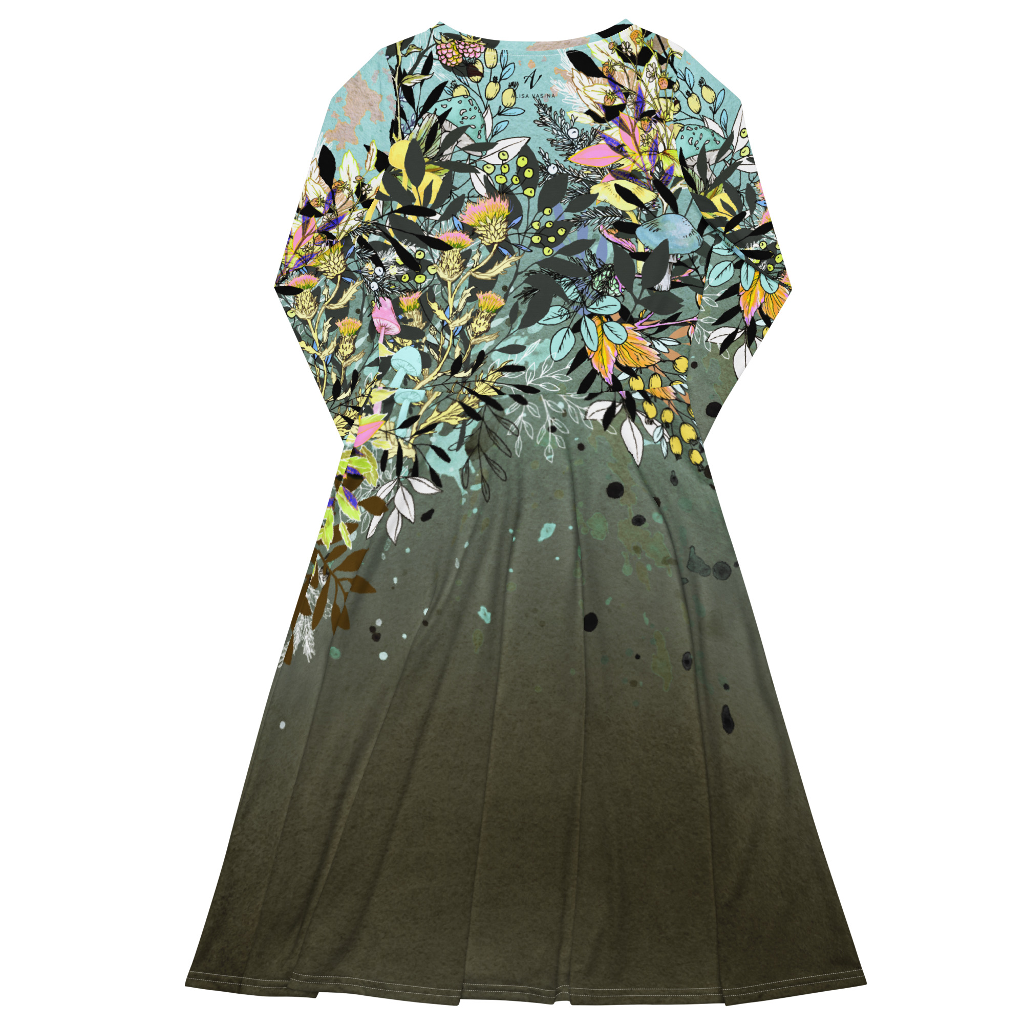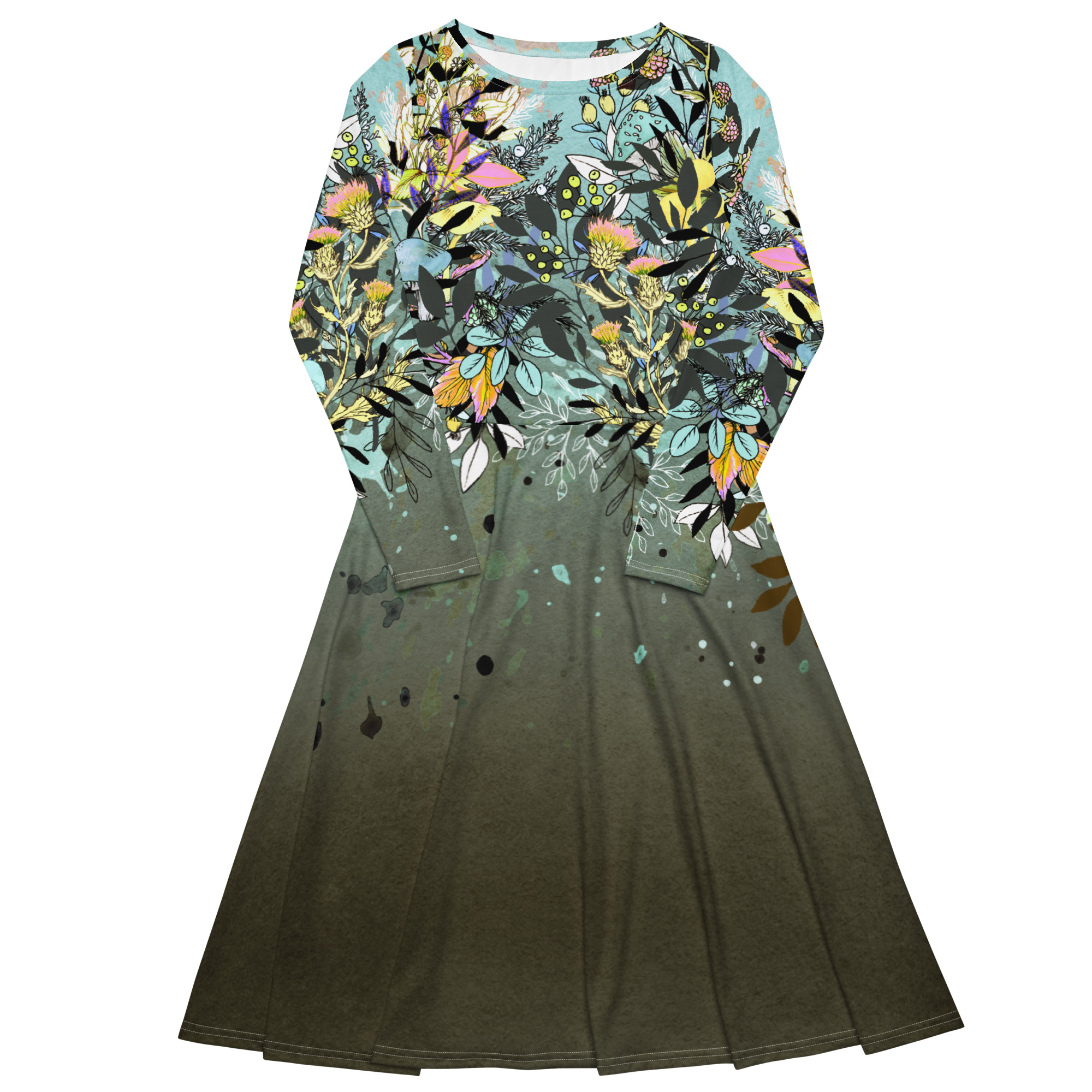 Kleit on kehasse istuv vöökohaga ja alt laieneva seelikuga, mis rõhutab kandja loomulikult kaunist siluetti. Kangas on valmistatud premium kvaliteetsest trikotaažist, mis koosneb 95% polüestrist ja 5% elastaanist, tagades kleidi mugavuse ja vastupidavuse. Kleidi midi pikkus ja pikad varrukad muudavad selle sobivaks nii igapäevaseks kandmiseks kui ka pidulikeks sündmusteks.